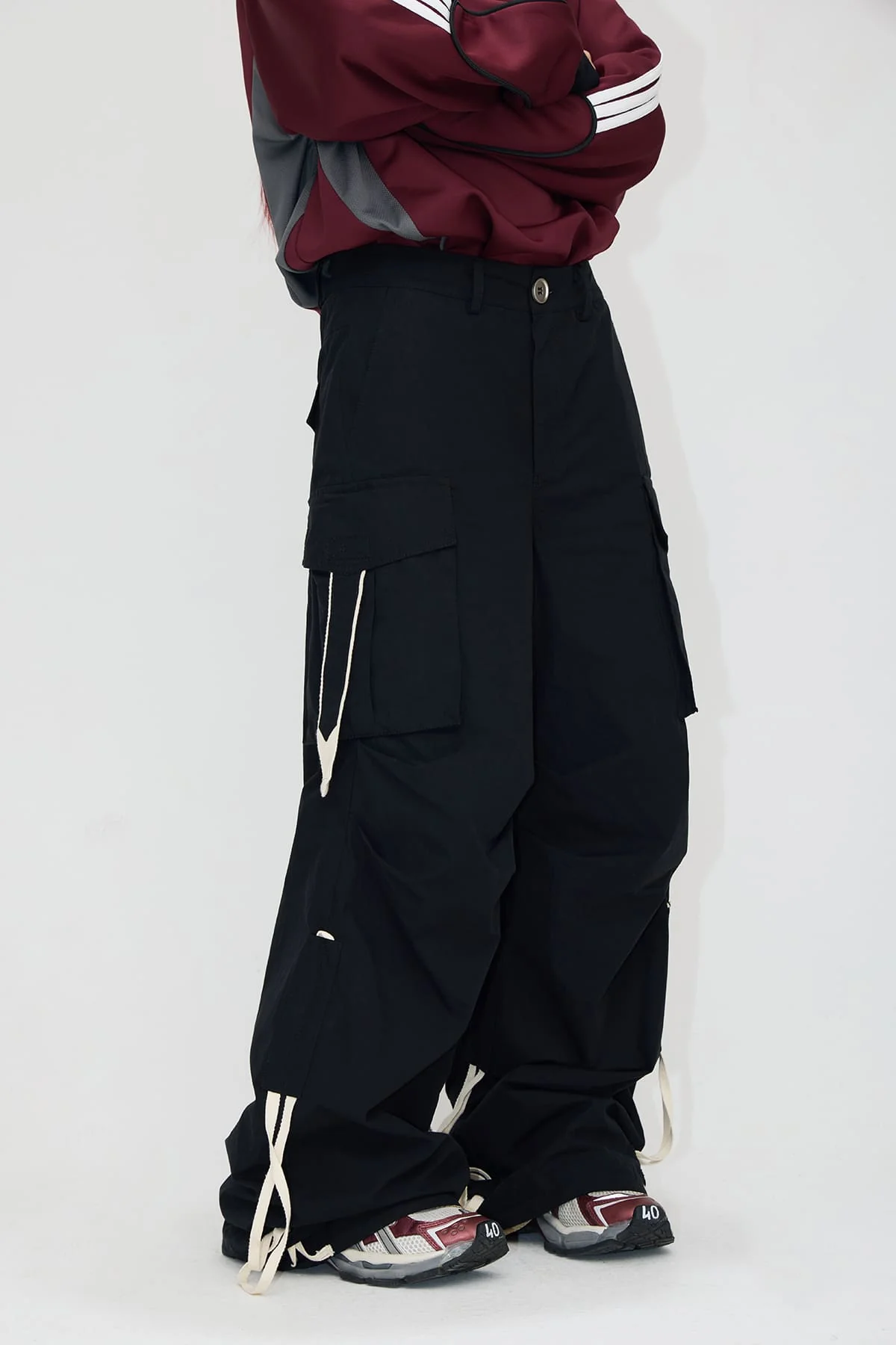 • Male model is 180cm/5′11″, weight 68kg/150lbs, waist 74cm/29in, hips 95cm/37in, wearing size L.